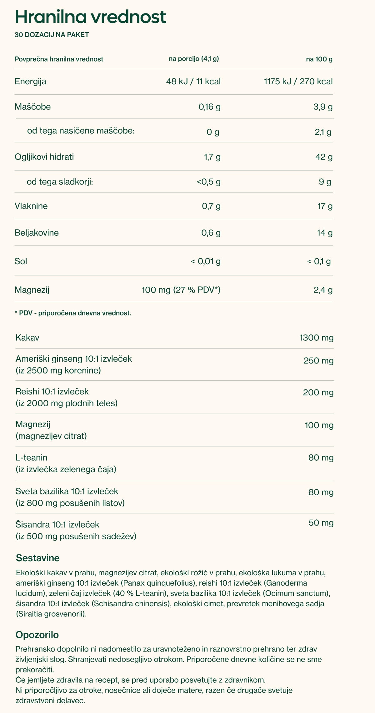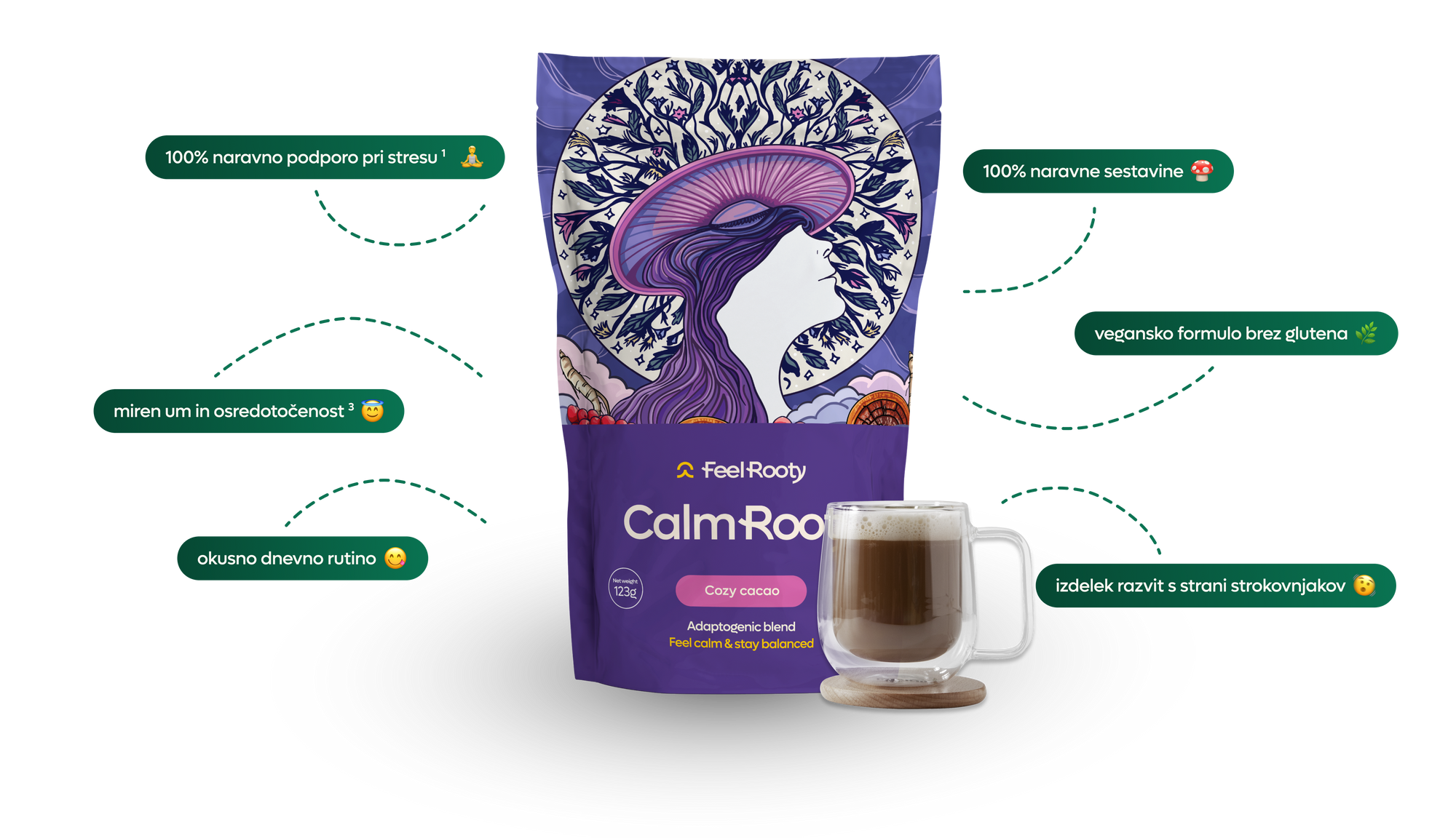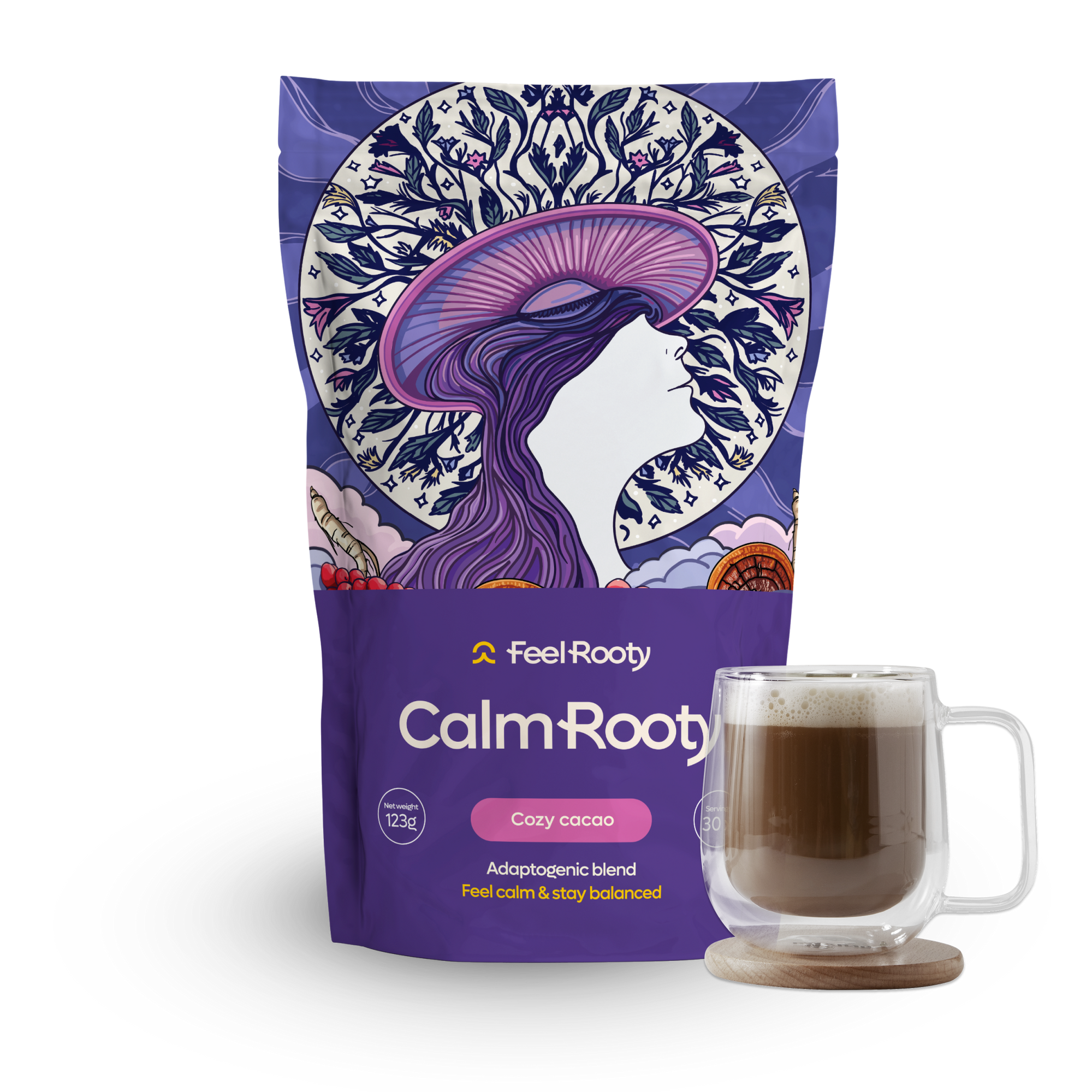 CalmRooty je okusno prehransko dopolnilo iz adaptogenov, superživil in medicinskih gob, zasnovano za pomiritev, naravno podporo pri stresu in notranje ravnovesje.¹ Ko je tempo hiter in telo pod stresom, je CalmRooty tu, da te nežno vrne v ravnovesje – naj bo to zjutraj, čez dan ali zvečer.