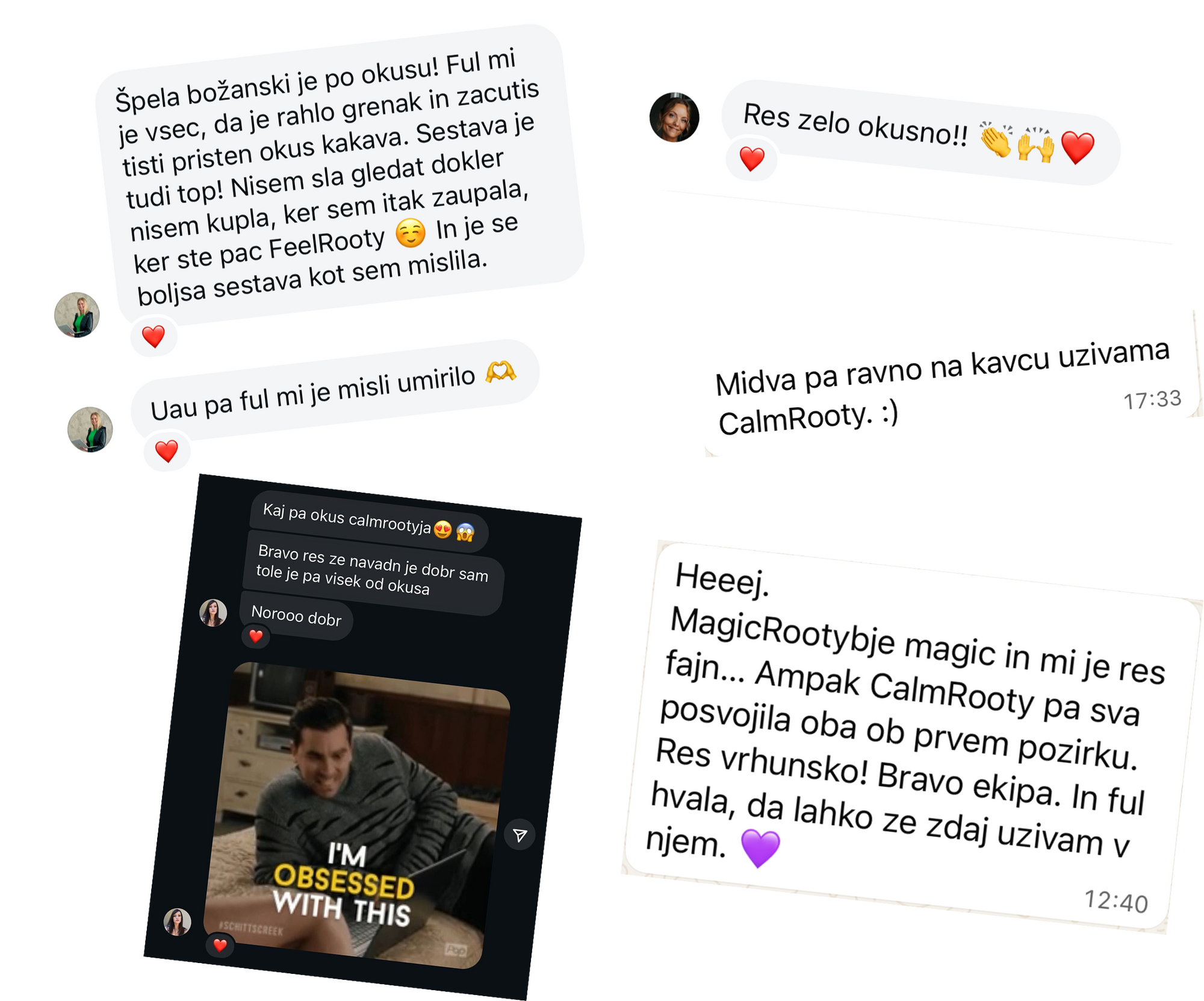 Pri FeelRooty prisegamo na najboljše sestavine – ekološko pridelane, iz okolij, kjer naravno najbolje uspevajo, skrbno ekstrahirane za največji učinek, z dokazano močjo neodvisnih laboratorijev in popolno sinergijo za tvoje dobro počutje.