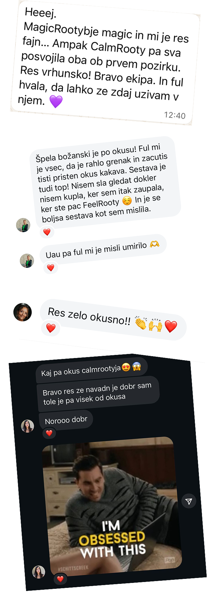 Pri FeelRooty prisegamo na najboljše sestavine – ekološko pridelane, iz okolij, kjer naravno najbolje uspevajo, skrbno ekstrahirane za največji učinek, z dokazano močjo neodvisnih laboratorijev in popolno sinergijo za tvoje dobro počutje.