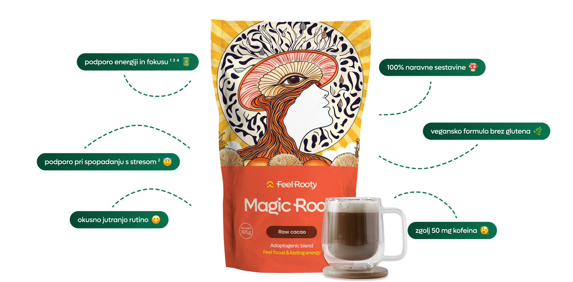 MagicRooty je na voljo tudi kot priročen travel pack (10 vrečk v paketu) – gre za manjše pakiranje v obliki sašejev, idealno za na pot. MagicRooty je okusno prehransko dopolnilo iz medicinskih gob, adaptogenih zelišč in vitamina B12, ki podpira jasnost misli, mentalno energijo in osredotočenost. ¹ Za mnoge je skodelica MagicRooty-ja nepogrešljiv jutranji ritual in ultimativno orodje za produktivnost.